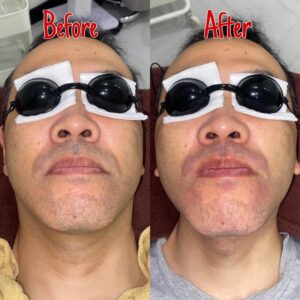 The beard area is still in progress before the hair is completely gone, but we’ve already achieved very promising results other surrounding areas no longer show any hair growth, which highlights how effective the treatment has been; the beard itself is naturally thicker and more stubborn, making it harder to remove, yet the ongoing reduction shows steady improvement with each session.