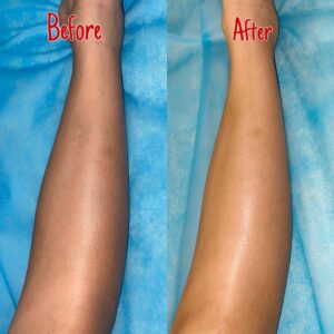 This is her 2nd session of kids’ hair removal focusing on the lower knee area, and the results so far are very promising. After just the first session, there was already a noticeable reduction in hair growth—most of the thicker hair has diminished, and only fine, thin hair remains, with some areas already becoming smoother. Although she will need a few more sessions for further reduction, the treatment is clearly effective and progressing gently and safely.