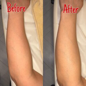 腕のSHR脱毛2回目のセッション✨ もともと腕の毛は細くて薄いため、ビフォーアフターの写真では大きな違いが見えにくいかもしれません。しかし施術後は毛の再生がほとんど見られず、目立つ毛は生えてきていません。これは施術が毛根にしっかり働きかけ、毛の成長を徐々に遅らせている証拠です。回数を重ねることで、さらに毛が細く少なくなり、腕の肌はよりなめらかで美しい状態を保つことができます。✨